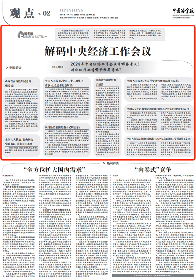 中央經(jīng)濟(jì)工作會(huì)議12月11日—12日在北京舉行。會(huì)議分析了當(dāng)前經(jīng)濟(jì)形勢(shì),部署2025年經(jīng)濟(jì)工作。在這次會(huì)議上,“更加積極的財(cái)政政策”“適度寬松的貨幣政策”“全方位擴(kuò)大國(guó)內(nèi)需求”“提高財(cái)政赤字率”“綜合整治‘內(nèi)卷式’競(jìng)爭(zhēng)”“持續(xù)用力推動(dòng)房地產(chǎn)市場(chǎng)止跌回穩(wěn)”“以科技創(chuàng)新引領(lǐng)新質(zhì)生產(chǎn)力發(fā)展”等諸多熱點(diǎn)提法涌現(xiàn),引發(fā)廣泛關(guān)注。《中國(guó)冶金報(bào)》將從鋼圈人士視角,第一時(shí)間解碼此次會(huì)議,并邀請(qǐng)專家圍繞相關(guān)熱詞展開解讀,以饗讀者。