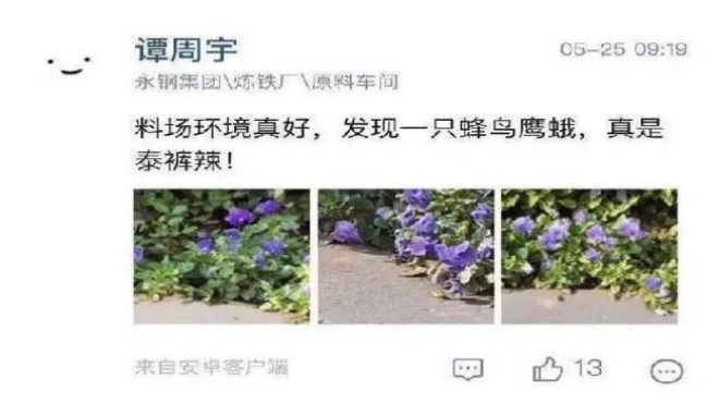近年來,為進一步提升全員環(huán)保意識,永鋼在現(xiàn)場污染源治理、項目建設過程中同步推進“園林工廠”風貌提升,倡導全員改善,按照“河道變濕地、車間變花園、廠區(qū)變景區(qū)”的思路,努力打造“春有花、夏有蔭、秋有果、冬有景”的“碧波塔影,田園鋼城”。累計建綠、增綠290.28萬m2,廠區(qū)綠化覆蓋率達37.7%,固碳4354噸/年。如今,企業(yè)綠樹環(huán)繞,周圍的環(huán)境也越來越生態(tài)化,喜鵲、斑鳩、白鷺等野生鳥類也來這里安家落戶。前段時間,原料場員工在廠區(qū)綠化中發(fā)現(xiàn)了一只蜂鳥,發(fā)在同事圈引起熱議。