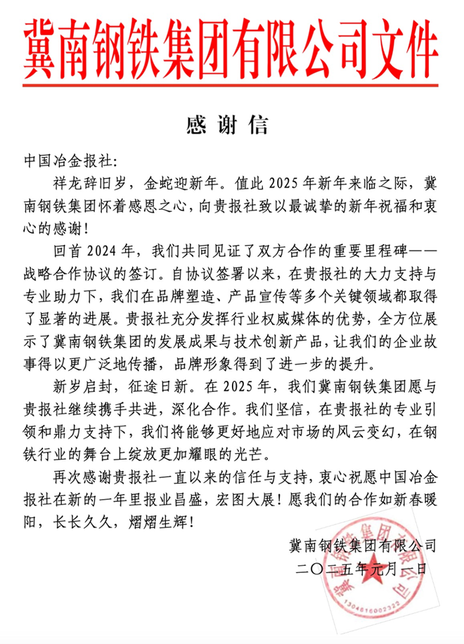 2025年1月1日,冀南鋼鐵集團(tuán)有限公司向中國冶金報社發(fā)來感謝信,感謝報社一年來的大力支持與專業(yè)助力,并希望雙方在未來的工作中繼續(xù)攜手共進(jìn),深化合作。