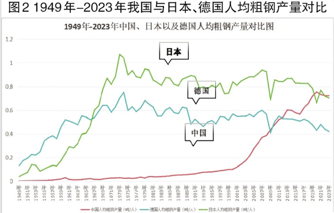 根據(jù)發(fā)達國家工業(yè)化歷程來看,人均產(chǎn)鋼量突破600千克,意味著該國已進入工業(yè)化成熟期,固定資產(chǎn)投資呈下降趨勢,與此同時,工業(yè)金屬行業(yè)進入漫長的衰退期。以德國為例,1969年人均粗鋼產(chǎn)量達到640千克后進入相對穩(wěn)定期,自1982年起,人均粗鋼產(chǎn)量開始呈震蕩下降趨勢(詳見圖2)。這一階段,德國在總產(chǎn)能下降與行業(yè)集中度提升的趨勢下,初期普鋼、中厚板鋼材產(chǎn)量占比率先提升,中后期特鋼產(chǎn)量占比顯著增加。同時,出口結(jié)構(gòu)逐步轉(zhuǎn)向特鋼,與當前我國制造業(yè)產(chǎn)業(yè)升級的趨勢相符。同樣,日本1973年粗鋼產(chǎn)量達到峰值的1.19億噸,隨后10年波動下滑,到1982年粗鋼產(chǎn)量降至1億噸;1983年—2002年,日本粗鋼產(chǎn)量穩(wěn)定在1.02億噸左右,較峰值水平僅下滑14.3%。因此,預計未來十幾年我國粗鋼產(chǎn)量將呈現(xiàn)緩慢下降態(tài)勢。