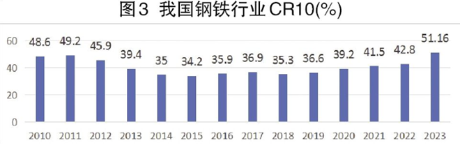 行業(yè)集中度加速提升。當前,我國鋼鐵行業(yè)相對于上游原材料行業(yè)、下游用鋼行業(yè)的集中度均偏低(見圖3),仍處于較為分散狀態(tài)。據(jù)統(tǒng)計,2023年,我國鋼鐵行業(yè)CR4、CR10分別為26.4%、51.16%。其中,CR4仍遠低于美國的79%、日本的80%和歐盟的73%。