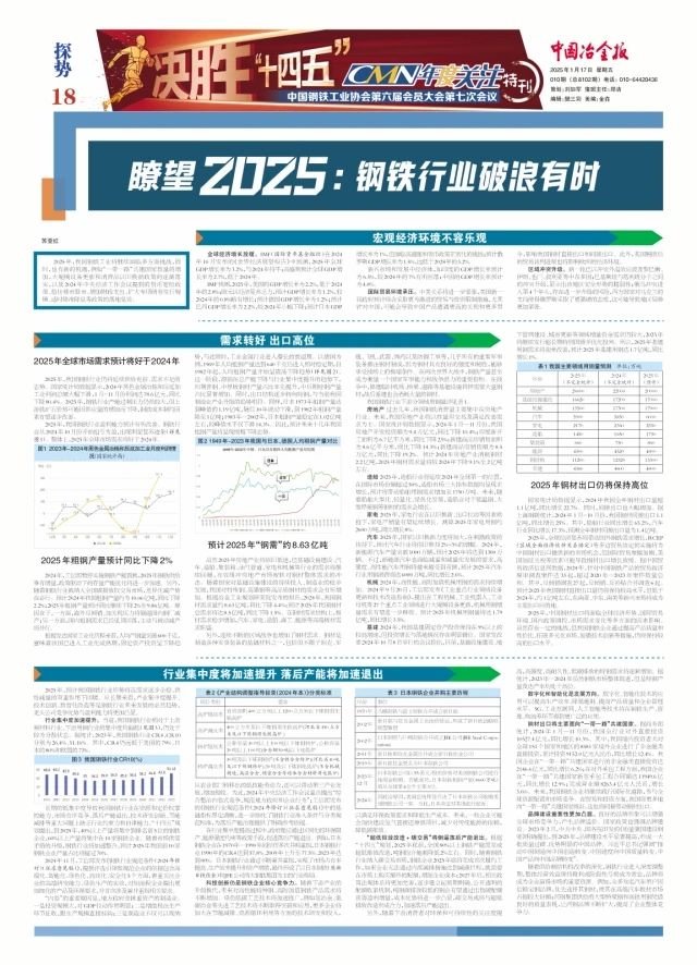 2025年,我國鋼鐵工業(yè)將繼續(xù)面臨多方面挑戰(zhàn),同時,也有新的機遇,例如“一帶一路”共建國家數(shù)量的增加,大規(guī)模設備更新和消費品以舊換新政策的逐漸落實,以及2024年中央經(jīng)濟工作會議提到的貨幣寬松政策、穩(wěn)住樓市股市、增加財政支出、擴大專項債券發(fā)行規(guī)模、適時降準降息等政策的落地見效。