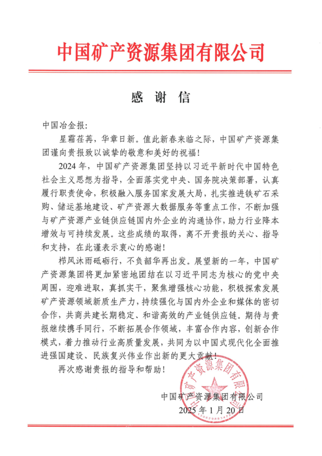 中國礦產(chǎn)資源集團向中國冶金報社發(fā)來感謝信
