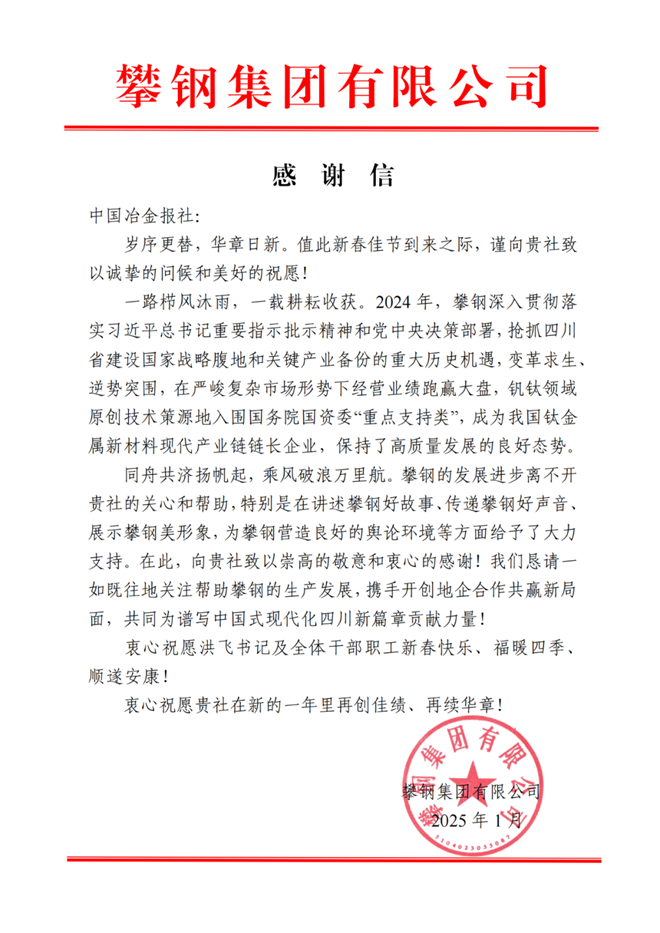 攀鋼集團(tuán)有限公司向中國冶金報社發(fā)來感謝信