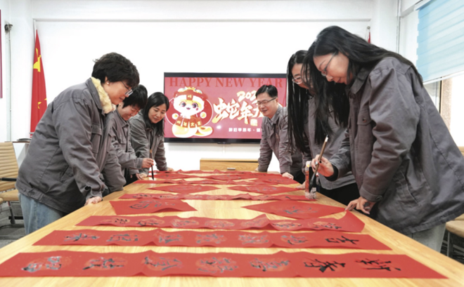 1月23日,河鋼集團唐鋼書法愛好者正在寫春聯(如圖)。新春佳節臨近,唐鋼開展“寫春聯 送祝福”活動,特別邀請了一批熱愛書法的職工義務書寫春聯,用筆墨將新春的祝福傳遞到職工心中,為即將到來的節日增添歡樂與祥和氛圍。(李陽 攝)