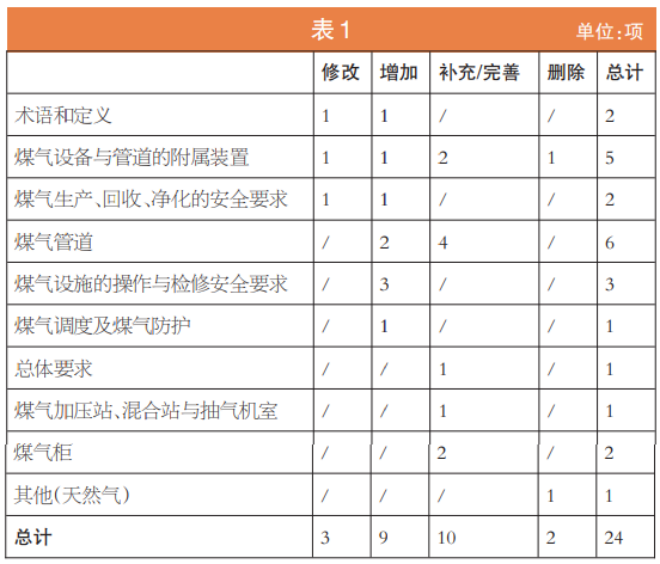其次,煤氣管道相關要求變化最多。如表1所示,該部分有6項改動,涵蓋2項增加、4項補充/完善,表明煤氣管道安全管理的規范化程度進一步提高。