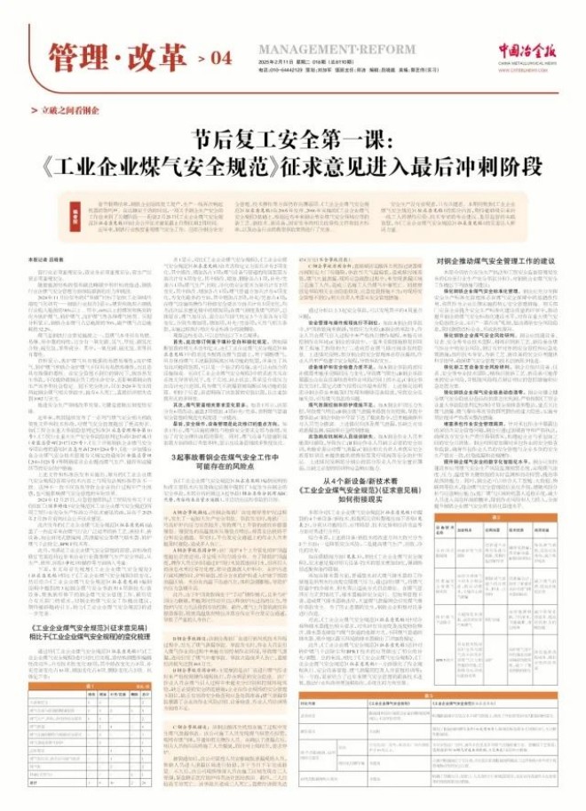 春節假期結束,鋼鐵企業陸續復工復產,生產一線再次響起機器的轟鳴聲。在這鉚足干勁的時刻,一項關乎鋼企生產安全的工作也來到了關鍵階段——距離2月25日《工業企業煤氣安全規范》(征求意見稿)向社會公開征求意見截止日期僅剩2周時間。