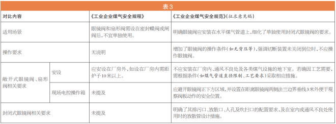 如在眼睛閥方面(見表3),相比《工業企業煤氣安全規程》,征求意見稿對相關設備/技術的要求更加細化,強調場景適配和條件限制。