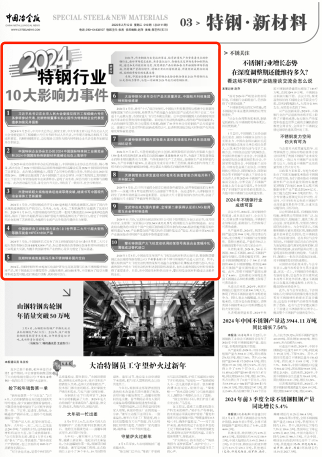 本期,中國冶金報(bào)社和中國特鋼企業(yè)協(xié)會(huì)聯(lián)合推出2024年特鋼行業(yè)10大影響力事件,與您一同回顧2024年我們的特鋼征程。