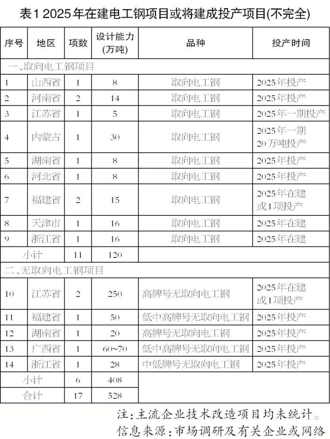 據不完全統計,截至2024年底,我國在建及建成投產的電工鋼項目17項以上(以公布為準,主流企業技術改造項目均未統計),預計2025年新增產能約為528萬噸,含取向電工鋼11項(產能120萬噸)、無取向電工鋼6項(產能408萬噸),其中建成投產項目13項的產能約為326萬噸,含取向電工鋼項目8項的產能約為68萬噸、無取向電工鋼項目5項的產能約為258萬噸。(見表1)