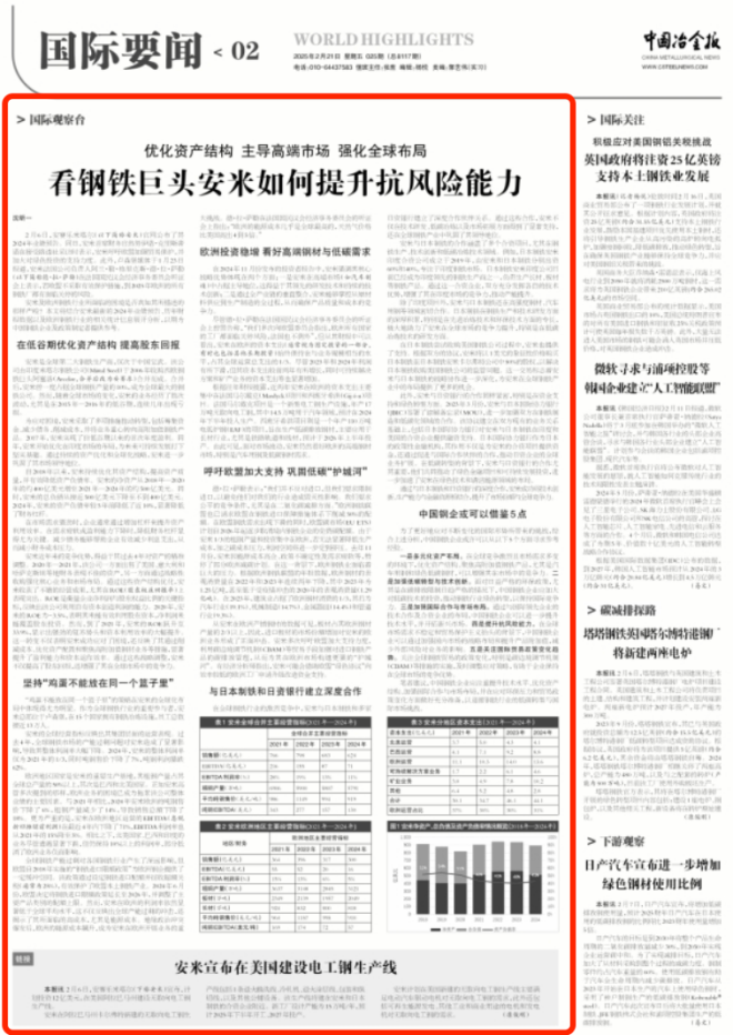2月6日,安賽樂米塔爾(以下簡稱安米)官網公布了其2024年業績預告。同日,安米首席財務官熱努伊諾·克里斯蒂諾在接受路透社采訪時表示,安米呼吁歐盟加強貿易保護,并加大對綠色投資的支持力度。此外,盧森堡媒體于1月23日報道,安米法國公司負責人阿蘭·勒·格里克斯·德·拉·薩勒(以下簡稱德·拉·薩勒)在法國國民議會經濟事務委員會聽證會上表示,若歐盟不采取有效保護措施,到2025年歐洲的所有鋼鐵廠都有面臨關停的風險。