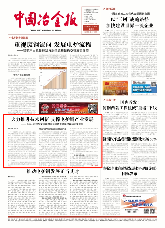 在采訪中,朱榮高度肯定了鋼協在推動電爐鋼研究和發展方面所做出的努力。比如,鋼協黨委書記、執行會長何文波,副書記兼秘書長姜維等親自帶隊到北科大實驗室,就電爐鋼發展進行調研、交流、探討和指導;朱榮團隊創新提出的近零碳排電弧爐煉鋼工藝,被中國鋼鐵工業協會確定為8項世界前沿重點低碳共性技術之一;等等。