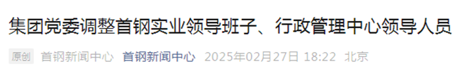 2月27日,首鋼新聞中心微信公眾號發布了《集團黨委調整首鋼實業領導班子、行政管理中心領導人員》一文。