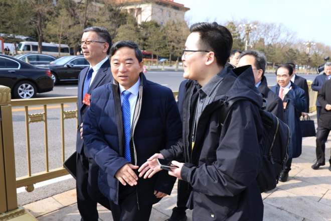 圖為全國政協委員,中國寶武黨委書記、董事長胡望明在步入會場前與中國冶金報社兩會報道組記者交流