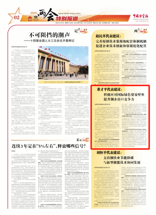 當前,全球低碳轉型加速推進,國際綠色貿易壁壘持續升級。2026年1月1日起,歐盟將正式對進口的鋼鐵、鋁、水泥等商品征收“碳關稅”?!皩脮r,我國對歐出口的鋼鐵產品將面臨每噸碳排放50歐元~70歐元的碳成本壓力,對我國鋼鐵出口形成強烈沖擊。”全國人大代表,中天鋼鐵集團黨委書記、董事局主席、總裁董才平表示。