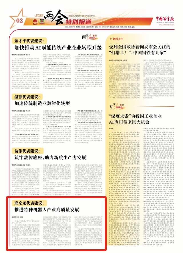 邢京龍建議,持續強化重點實驗室、工程中心、工業設計中心等國家級創新平臺建設,發揮國家重大科技專項等研發資金作用;強化礦山無人化、地面空中協同、百米以上高層建筑消防、移動重載機器人等應用領域研究;強化產業鏈創新,推動形成特種機器人“零部件—整機—系統集成”全鏈條生態,打造上下游企業協同創新的新局面。