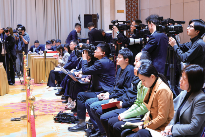 圖為中國冶金報社兩會報道組記者樊三彩在記者區拍攝。