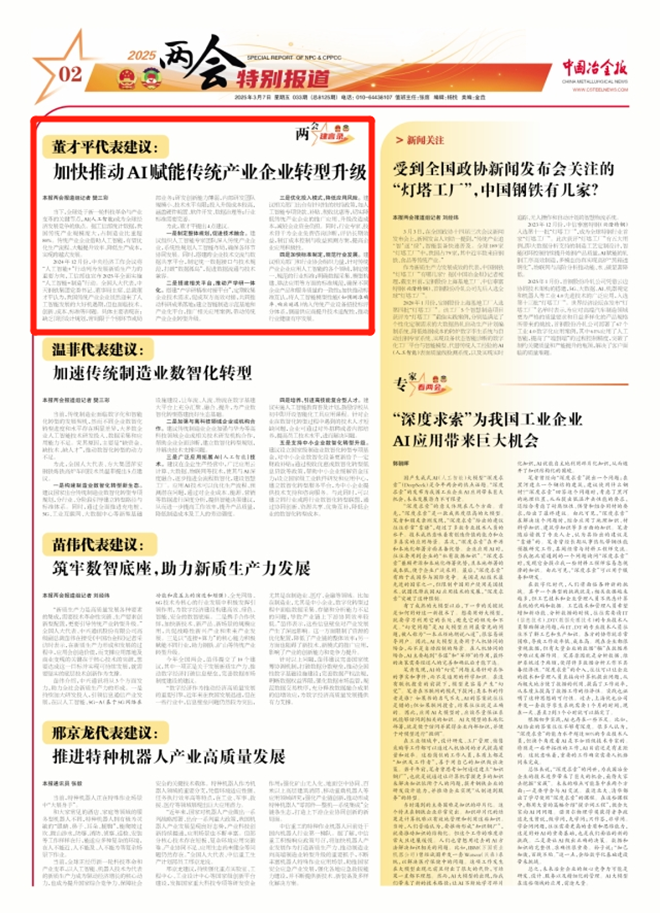 2024年12月份,中央經濟工作會議將“人工智能+”行動列為發展新質生產力的重要方向,工信部也宣布2025年全面實施“人工智能+制造”行動。全國人大代表,中天鋼鐵集團黨委書記、董事局主席、總裁董才平認為,我國傳統產業企業雖然迎來了人工智能發展的大好機遇期,但也面臨技術、創新、成本、標準等問題。具體主要表現在:缺乏頂層設計規劃,常局限于個別環節或局部業務;研發創新能力薄弱,內部研發團隊規模小、技術水平有限;投入升級成本較高,涵蓋硬件購置、軟件開發、數據治理等;行業標準需要完善。
