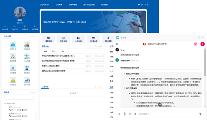 業務AI助手整合了設計業務需要的國家標準、行業標準、地方標準及團體標準,并深度集成公司沉淀多年的校審記錄、工程FAQ(常見問題)等經驗知識,構建了契合公司業務特點的專用知識庫。員工只需以自然語言提問,即可快速獲得規范條文解讀、流程操作指南、設計方案分析、設計校審意見等內容。同時,AI助手還能提供復雜公式計算和推理過程,為方案選型提供科學指導,有效提升知識資產利用率的同時,顯著提升工作效率讓知識、讓京誠公司70年工程經驗轉化為生產力。