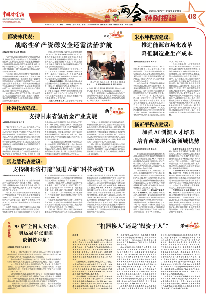 “建議充分發(fā)揮西部地區(qū)新能源富裕的優(yōu)勢,積極推動酒鋼、金川公司、白銀公司等企業(yè)投資氫冶金示范項(xiàng)目,形成新能源發(fā)電—制氫儲氫—?dú)湟苯鹁G色產(chǎn)業(yè)鏈條。充分發(fā)揮酒鋼集團(tuán)微電網(wǎng)和新能源優(yōu)勢,支持酒鋼集團(tuán)開展氫冶金中試研究和規(guī)模化生產(chǎn),形成可復(fù)制的推廣模式。”杜鈞表示,建議將鋼鐵企業(yè)應(yīng)用純氫冶金技術(shù)列入設(shè)備更新和技術(shù)改造支持范疇,列入首臺(套)技術(shù)裝備推廣應(yīng)用指導(dǎo)目錄,予以政策支持。