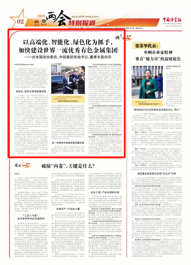 “制造業是國民經濟的主體,是立國之本、興國之器、強國之基。推動制造業高端化、智能化、綠色化發展是我們實現新型工業化的重要途徑,也是推動我國從制造大國向制造強國躍升的重要抓手。”近日,在全國政協十四屆三次會議期間,全國政協委員,中鋁集團黨組書記、董事長段向東向《中國冶金報》記者表示,在加快推動制造高端化、智能化、綠色化發展的新征程中,中鋁集團將緊密結合“新中鋁”目標舉措,系統謀劃好集團“十五五”規劃,加快建設世界一流優秀有色金屬集團。