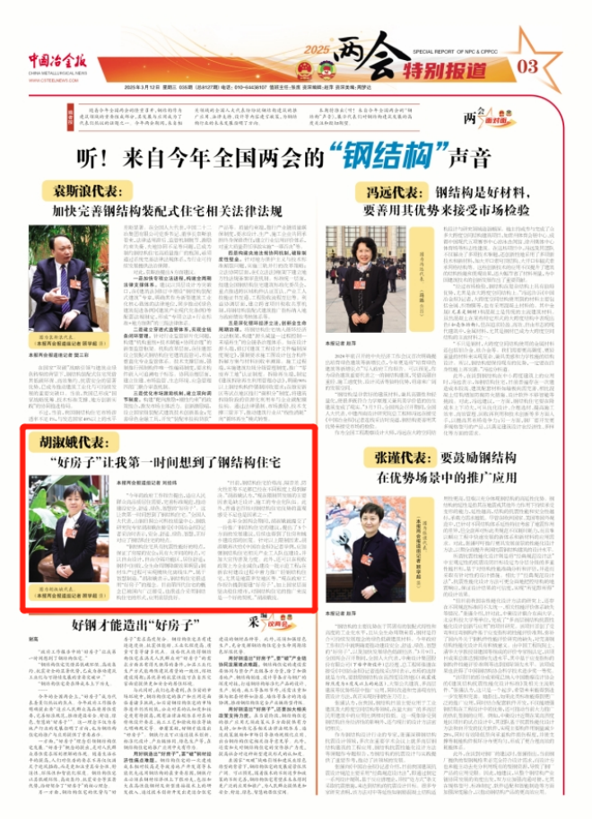 “今年的政府工作報(bào)告提出,適應(yīng)人民群眾高品質(zhì)居住需要,完善標(biāo)準(zhǔn)規(guī)范,推動(dòng)建設(shè)安全、舒適、綠色、智慧的‘好房子’。這讓我第一時(shí)間想到了鋼結(jié)構(gòu)住宅。”全國(guó)人大代表,山鋼日照公司科技質(zhì)量中心、鋼鐵研究院專家胡淑娥在接受《中國(guó)冶金報(bào)》記者采訪時(shí)表示,安全、舒適、綠色、智慧,正好對(duì)應(yīng)了鋼結(jié)構(gòu)住宅的特點(diǎn)。