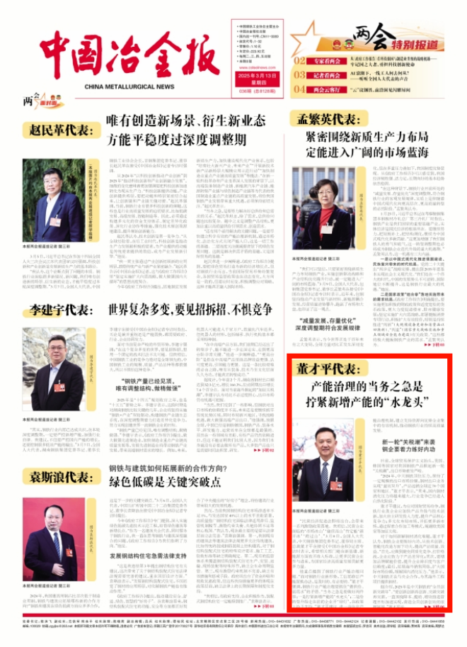 他重點提到了鋼鐵行業產能治理問題。“面對鋼鐵行業新形勢,工信部修訂產能置換辦法,是及時的、有必要的。”董才平強調,鋼鐵行業產能治理要抓住“強供給、弱需求”的矛盾。“當務之急是要做好兩件事:一是擰緊新增產能的‘水龍頭’;二是給轉型升級走在前的企業開‘綠燈’,在政策上給予支持。”董才平建議,進一步優化產能治理機制,建立支持資源向優勢企業集中的有效機制,推動鋼鐵行業持續高質量發展。