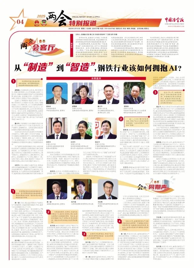 可以肯定的是,今后人工智能將應用于鋼鐵行業的采購、生產、銷售等各個環節,關于鋼鐵行業該如何擁抱AI的討論也將愈發熱烈。本期《兩會會客廳》以“從‘制造’到‘智造’,鋼鐵行業該如何擁抱AI?”為主題,特邀請鋼鐵行業及有關領域的全國人大代表、政協委員及相關企業代表,請他們從鋼企應如何利用智能化改造降本增效、如何主動適應AI重塑的格局、如何解決“人機協同”難題等方面談談AI如何賦能鋼鐵行業的新質生產力發展。