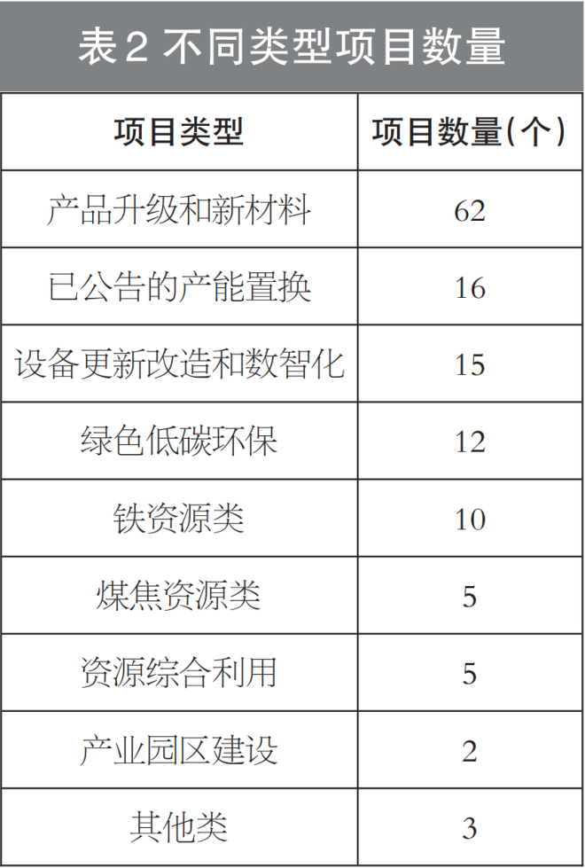 在項目類型方面,產品升級改造與新材料項目最多,高達62個,接近總項目數量的一半;涉及已完成產能置換公告的續建或新建項目有16個,排在項目類別數量的第二位;設備更新改造和數智化項目建設共15個;綠色低碳環保項目數量為12個。此外,還涵蓋鐵資源項目、煤焦資源項目、資源綜合利用項目等。
