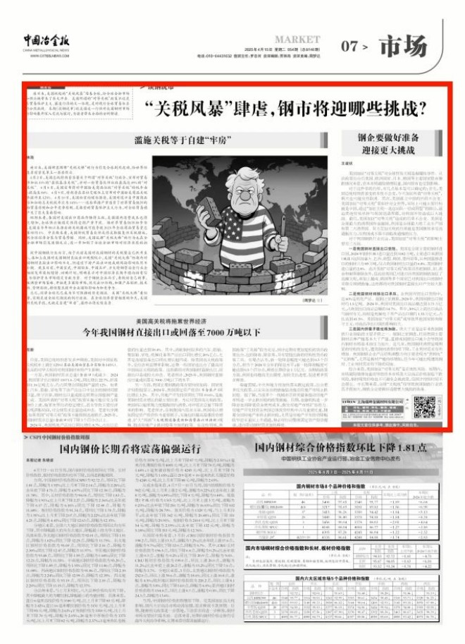 綜合來看,美國加征“對等關(guān)稅”是系統(tǒng)性風險。短期內(nèi),市場避險情緒加重將導(dǎo)致資本市場及大宗商品價格面臨下跌風險,鋼材現(xiàn)貨價格也不可避免會被波及,但預(yù)計持續(xù)時間不會很長。中長期來看,全球“關(guān)稅戰(zhàn)”將導(dǎo)致我國鋼鐵行業(yè)供需矛盾加大,鋼鐵企業(yè)要做好迎接更大挑戰(zhàn)的準備。