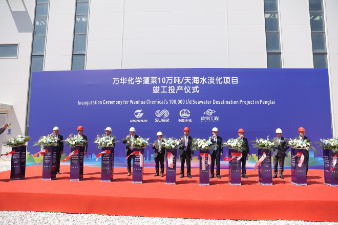 投產儀式現場,眾多行業領袖與嘉賓齊聚一堂,共同見證了這一歷史性的輝煌時刻。自然資源部天津海水淡化與綜合利用研究所副所長張秋豐、煙臺市投資促進中心副主任張剛、萬華化學集團股份有限公司黨委書記兼董事長廖增太、北京首鋼國際工程技術有限公司黨委書記兼董事長吳禮云、蘇伊士集團全球副總裁Yvan Treal、中鐵上海工程局集團有限公司黨委書記兼董事長王建營等出席了儀式。