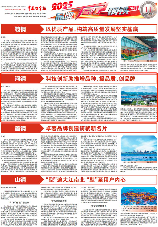 唐鋼2000兆帕級新成分吉帕級超高強鋼順利下線,為汽車行業輕量化發展提供最優材料解決方案;邯鋼國內首發抗拉強度1500兆帕、1.0毫米極限薄規格耐腐蝕冷軋熱成型鋼C2101NSSL并交付客戶使用,填補了國內冷軋熱成形鋼無耐腐蝕系列產品的空白;承德釩鈦立足釩鈦特色優勢,全方位打造釩鈦品牌,連續10年、累計30余個產品榮獲冶金產品實物質量“金杯獎”;大河金屬“會呼吸的彩涂板”“舌尖上的金屬”,為家電家居、食品飲品包裝等提供顏值引領和安全守護,走進千家萬戶,賦能美好生活……(余天門 張培軍)