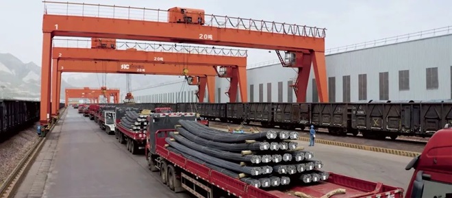 圖為陜鋼集團(tuán)生產(chǎn)的“禹龍”牌鋼材正在通過鐵運(yùn)專線運(yùn)往全國(guó)各地。 (靳光輝 攝)