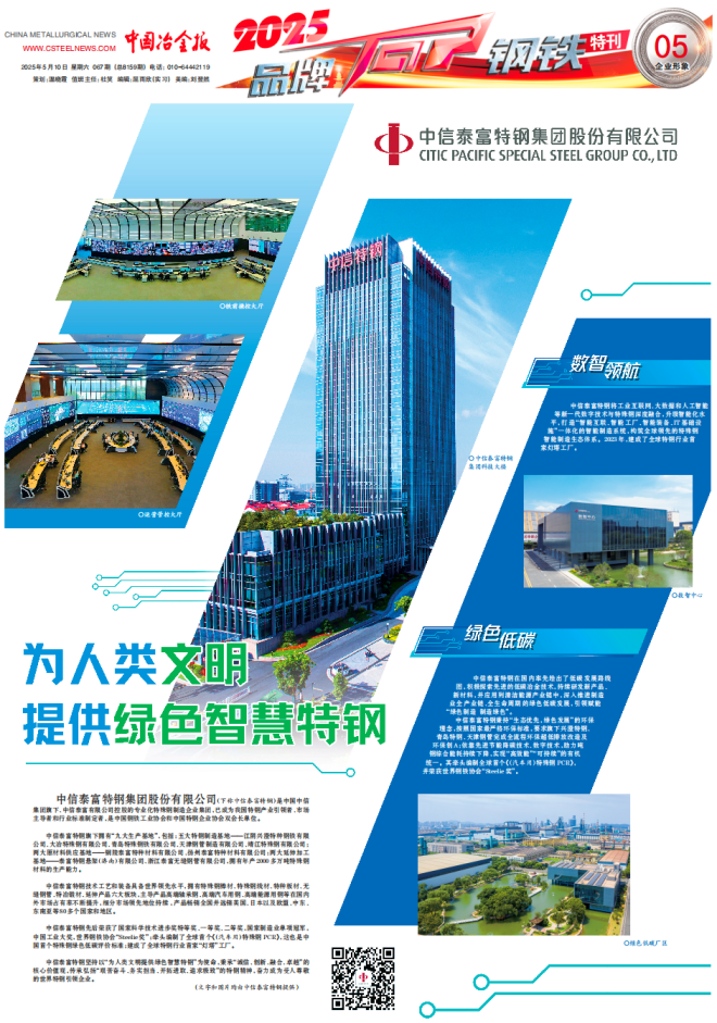 中信泰富特鋼先后榮獲了國家科學技術進步獎特等獎、一等獎、二等獎,國家制造業單項冠軍,中國工業大獎,世界鋼鐵協會“Steelie獎”;牽頭編制了全球首個《(汽車用)特殊鋼 PCR》,這也是中國首個特殊鋼綠色低碳評價標準;建成了全球特鋼行業首家“燈塔”工廠。