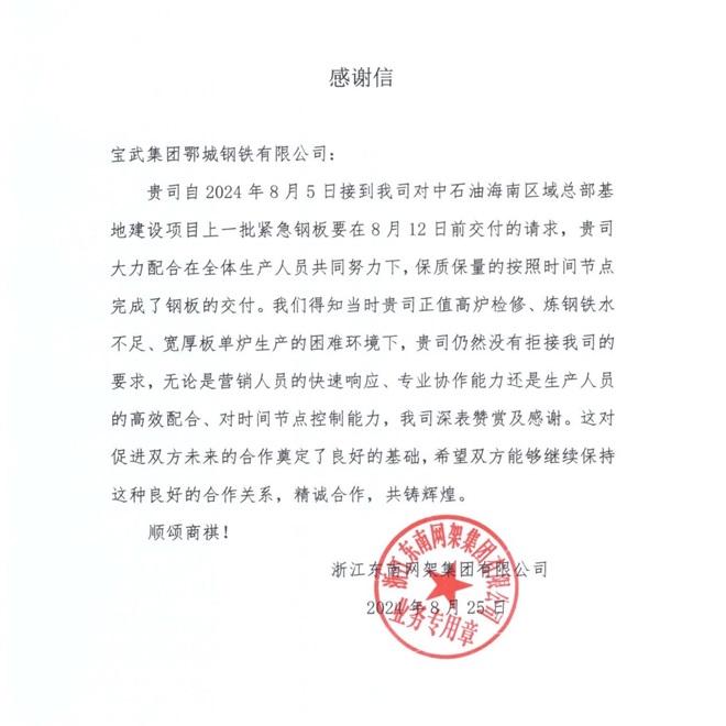 在客戶評價方面,鄂鋼多次被中集集團、三一重工等評為“優秀供應商”。2024年8月份,浙江某客戶在感謝信中稱贊道:“鄂鋼‘嚴細實快’的作風、高效的供貨能力令人印象深刻。”