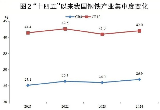 “十四五”以來,我國鋼企聯合重組取得了積極進展,收獲很多寶貴經驗。中國寶武先后重組昆鋼、新鋼和戰略投資山鋼,鞍鋼集團先后重組本鋼、凌鋼,中信泰富特鋼與南鋼攜手打造全球最大的專業化特鋼企業,建龍重整西寧特鋼,敬業集團相繼收購連云港興鑫鋼鐵、日鋼營口中板。受此推動,“十四五”以來,我國鋼鐵產業的粗鋼產量集中度(“CR”)波動回升,“CR4”由2021年的25.1%上升至2024年的26.9%,上升1.8個百分點;“CR10”由2021年的41.4%上升至2024年的42.0%,上升0.6個百分點。(見圖2)
