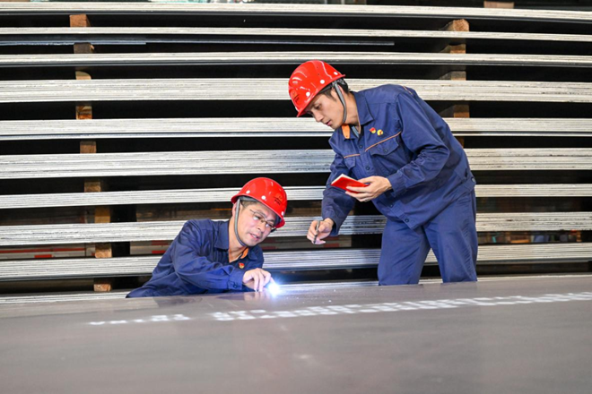 湘鋼技術(shù)人員正在對鋼板進行表面質(zhì)量檢查。(賀意波 拍攝)