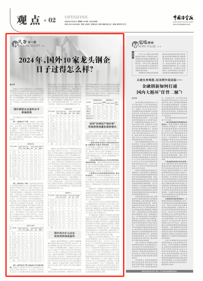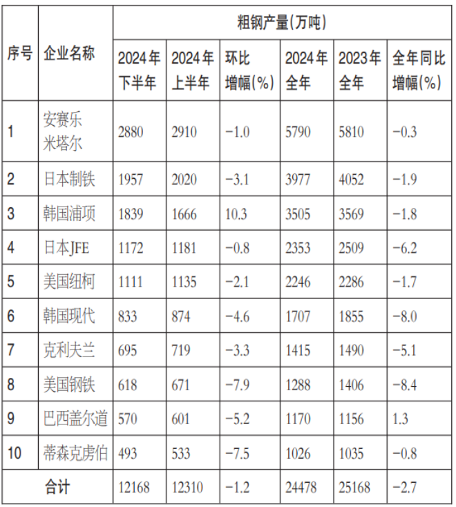 2024年,世界經(jīng)濟溫和復(fù)蘇,但在地緣政治緊張加劇、供應(yīng)鏈重構(gòu)加深等因素的交織影響下,全球經(jīng)濟增長動力不足,制造業(yè)面臨多重困境,住房建設(shè)活動下降,拖累全球鋼鐵需求下滑。本文收集整理了國外10家鋼鐵企業(yè)以及四大礦山企業(yè)已公布的全年財報數(shù)據(jù),從粗鋼生產(chǎn)、營業(yè)收入、盈利狀況等幾方面進行具體分析。