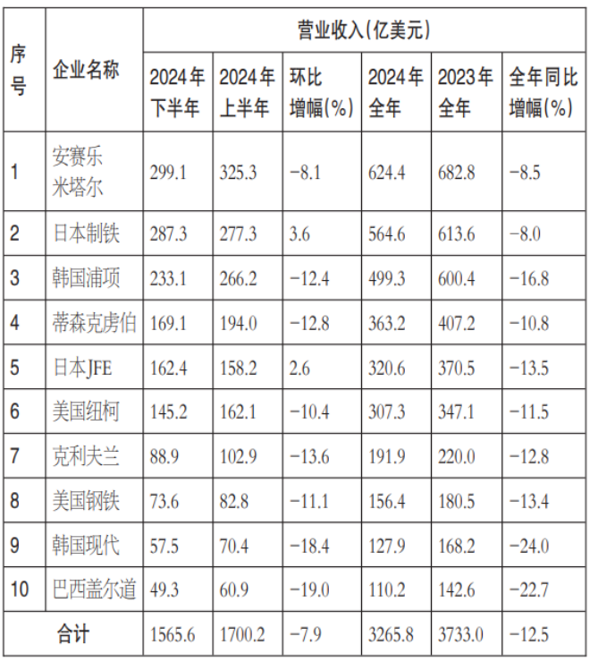 第二,營業(yè)收入下降。據(jù)英國商品研究所公布的數(shù)據(jù),2024年全年,國際鋼材價格指數(shù)(CRU)平均值為197.5點,同比下降22.5點,降幅為10.21%。分地區(qū)看,北美市場與歐洲市場價格指數(shù)差距較小,均明顯高于亞洲市場價格指數(shù)。從同比看,北美指數(shù)同比下降8.87%,歐洲指數(shù)同比下降10.20%,亞洲指數(shù)同比下降11.27%。從半年環(huán)比看,下半年全球指數(shù)環(huán)比下降12.88%,其中北美指數(shù)下降18.19%、歐洲指數(shù)下降9.41%、亞洲指數(shù)下降10.89%。受產(chǎn)量下降和價格下降的雙重影響,國外鋼鐵企業(yè)營業(yè)收入環(huán)比、同比均明顯下降。2024年,10家國外企業(yè)合計營業(yè)收入為3265.8億美元,同比下降12.5%。其中2024年下半年,國外企業(yè)合計營業(yè)收入為1565.6億美元,環(huán)比下降7.9%。分企業(yè)看,10家國外企業(yè)2024年營業(yè)收入均同比下降,其中8家降幅在10%以上。具體各企業(yè)實現(xiàn)營業(yè)收入情況見下表: