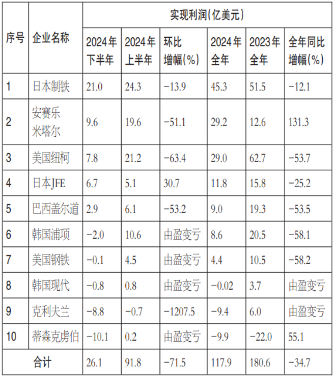 第三,盈利狀況下滑,但盈利水平仍相對較高。2024年,10家國外企業(yè)合計實現(xiàn)利潤117.9億美元,同比下降34.7%。分企業(yè)看,在10家國外企業(yè)中,只有安賽樂米塔爾和蒂森克虜伯利潤同比增長,其余8家企業(yè)同比均大幅下降。日本制鐵2024年盈利狀況非常突出,通過關(guān)閉高爐、減少供給來壓縮固定成本,并提高面向車企等大客戶的銷售價格;主動調(diào)整經(jīng)營結(jié)構(gòu),大幅度增加電工鋼產(chǎn)量;退出與寶鋼股份的合資業(yè)務(wù),把經(jīng)營資源集中至美國、印度和東南亞市場;積極拓展海外原料市場,提高原材料自給率。通過這些調(diào)整,日本制鐵2024年上半年、下半年、全年實現(xiàn)利潤均排名第一位,且保持非常大的優(yōu)勢。具體各企業(yè)實現(xiàn)利潤情況見下表: