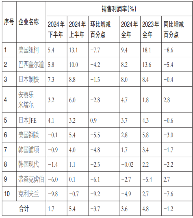 2024年,10家國外企業(yè)平均銷售利潤率為3.6%,同比下降1.2個百分點。分企業(yè)看,美國紐柯、巴西蓋爾道和日本制鐵銷售利潤率分別達到9.4%、8.2%和8.0%,領(lǐng)先于其他鋼鐵企業(yè),也是僅有的3家利潤率超過8%的企業(yè);安賽樂米塔爾、日本JFE和美國鋼鐵的利潤率在2.5%以上,也處于較好的水平;韓國的2家企業(yè)盈利水平相對較低,韓國浦項全年利潤率僅為1.7%,下半年出現(xiàn)虧損,韓國現(xiàn)代下半年同樣虧損,全年處于盈虧邊緣。總體看,2024年,歐美企業(yè)盈利水平最高,日本企業(yè)其次,韓國企業(yè)相對較低。反觀國內(nèi)情況,據(jù)國家統(tǒng)計局數(shù)據(jù),2024年黑色金屬冶煉和壓延加工業(yè)銷售利潤率僅為0.36%,虧損面達31%。據(jù)中國鋼鐵工業(yè)協(xié)會數(shù)據(jù),2024年會員鋼鐵企業(yè)銷售利潤率為0.73%,虧損面達39%。由此可見,雖然全球鋼鐵行業(yè)都在經(jīng)歷寒冬,但國外鋼鐵企業(yè)盈利能力相比國內(nèi)企業(yè)仍有明顯優(yōu)勢。具體各企業(yè)銷售利潤率情況見下表: