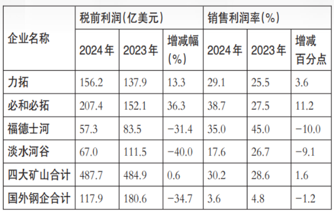 雖然鐵礦石價格下降,但四大礦山企業(yè)的盈利狀況依然保持強勁。2024年四大礦山合計實現(xiàn)利潤487.7億美元,同比增長0.6%,比10家國外鋼鐵企業(yè)合計利潤多出近370億美元。2024年,四大礦山平均銷售利潤率為30.2%,同比上升1.6個百分點,比10家國外企業(yè)平均銷售利潤率高出26.6個百分點。具體四大礦山企業(yè)稅前利潤和利潤率情況見下表: