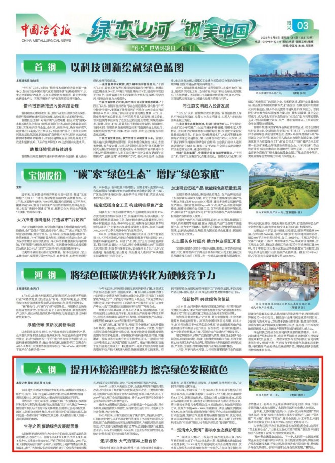 太鋼先后獲評為首批國家級水效領跑者企業、山西省“節水標桿企業”,“太鋼水生態化雙循環管理”獲世界不銹鋼協會“不銹鋼工業獎”可持續發展獎金獎。