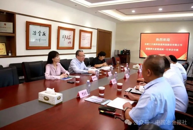 9月25日,合肥工大高科信息科技股份有限公司(以下簡稱“工大高科”)副董事長諸葛戰斌一行到訪中國冶金報社,與中國冶金報社副社長范鐵軍圍繞人工智能、工業互聯網等新一代信息技術在冶金企業鐵路運輸及非煤礦山運輸生產中的實踐應用與未來合作進行座談交流。