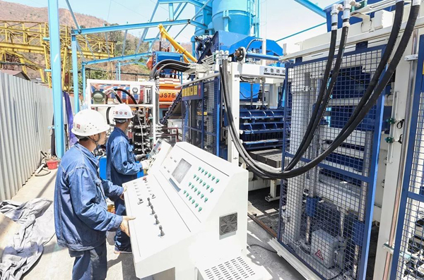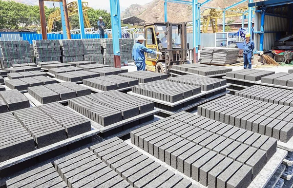 歷經艱苦努力,攀鋼建成了目前攀枝花市設備最先進、產品質量最優的免燒磚試驗線,并于今年5月10日正式運行。該試驗線具有自動化程度高、計量精度高、低能耗、低粉塵、低噪音、效率高、周期短、節能環保等優勢,通過更換模具即可生產標磚、路面磚、植草磚、透水磚、路沿石、擋墻砌塊、空心砌塊、自保溫砌塊等不同類別、不同規格的免燒類建材制品。