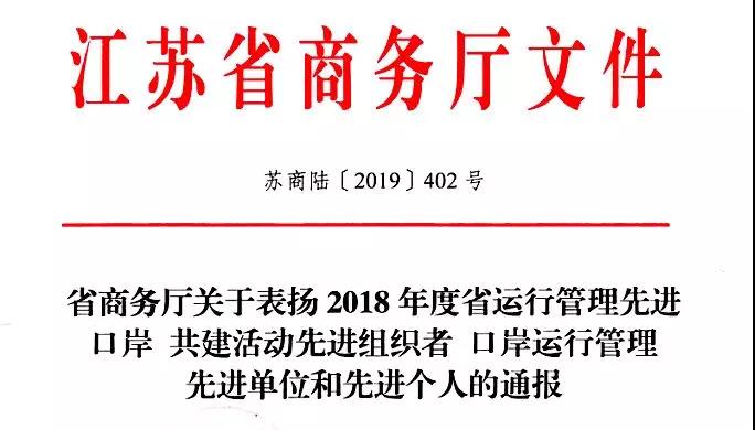近日江蘇省商務廳下發了《省商務廳關于表揚2018年度省運行管理先進口岸共建活動先進組織者口岸運行管理先進單位和先進個人的通報》永鋼集團子公司江蘇宏泰物流有限公司獲評“江蘇省口岸運行管理先進單位”