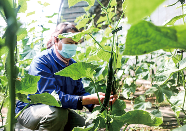 圖為張宣高科集企公司職工正在檢查黃瓜長勢。(記者 李巍 攝)