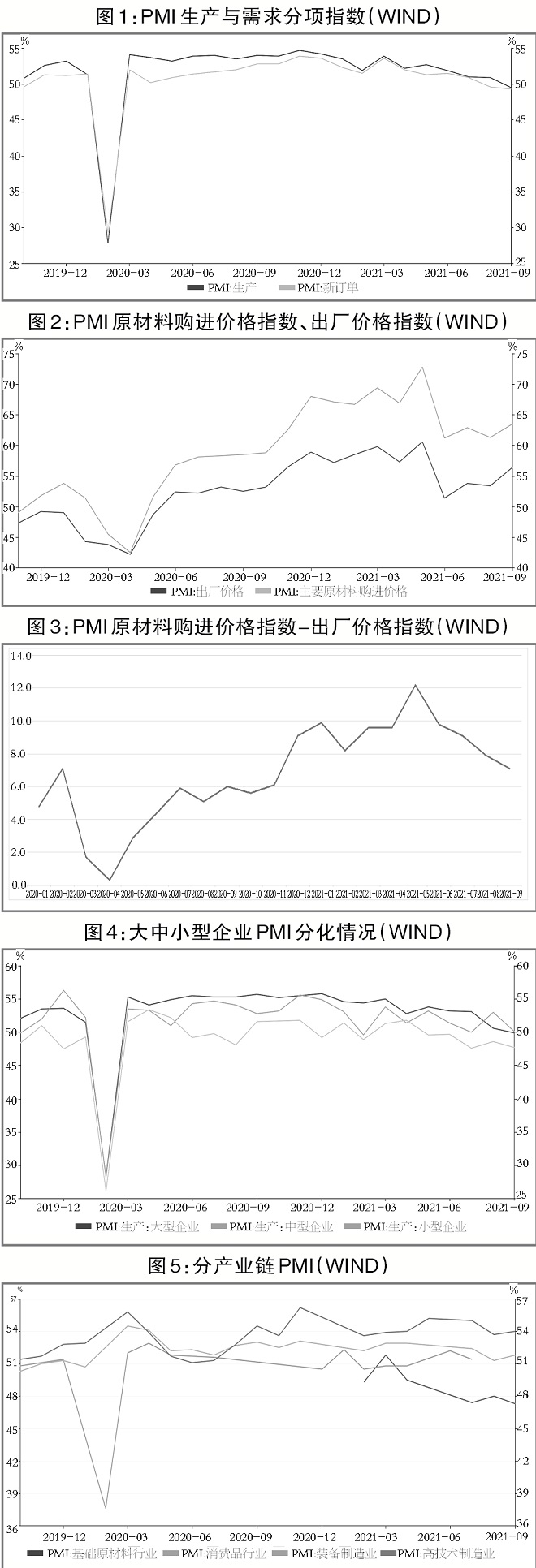 我國制造業PMI生產指數自2020年2月份以來首次跌落至“榮枯線”以下,環比大幅下行1.4個百分點至49.5%,是下滑最嚴重的分項,也是拖累制造業PMI下滑的最大因素。一般而言,除春節長假外生產指數會高于采購量指數,生產動力在前、采購意愿在后。今年9月份,我國首現生產指數低于采購量指數,生產指數從今年3月的高點53.9%一路下滑至49.5%,回落4.4個百分點;采購量指數則同步從今年3月份的高點53.10%一路下滑至49.7%,回落3.4個百分點。9月份生產指數低于采購量指數首現差值正0.2個百分點,釋放出生產受需求、限電等諸多因素限制而動力嚴重不足的信號。