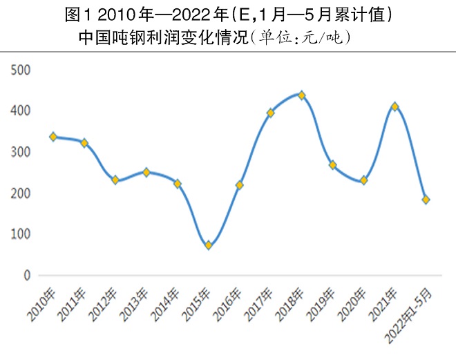 在鋼材價格相對疲軟而原料價格相對高漲的整體格局下,2022年上半年,我國鋼鐵行業(yè)利潤大幅縮水。根據(jù)國家統(tǒng)計局公布的數(shù)據(jù)計算,2022年1月—5月份,我國累計行業(yè)噸鋼利潤僅為184元,遠低于2021年411元的水平,僅高于2015年幾近全行業(yè)虧損狀態(tài)下的歷史低點(見圖1)。
