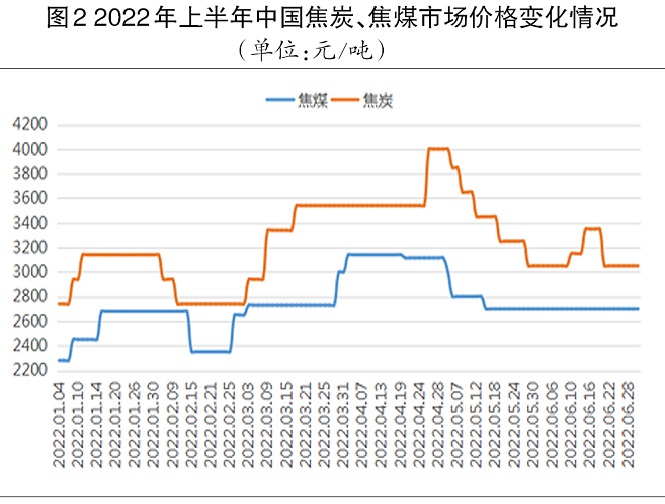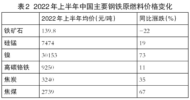 市場統(tǒng)計數(shù)據(jù)顯示(見表2),今年上半年,普氏鐵礦石價格指數(shù)(CIF中國主要港口,干基,不含稅)平均價格為139.8美元/噸,較2021年同期180.0美元/噸的價格下跌超過22%。同期,我國硅錳市場(內蒙古,Mn60Si14)平均價格為7474元/噸,較2021年上半年6255元/噸的價格上漲超過19%。我國不銹鋼生產所必需的鎳(LME3個月,電子盤,收盤價)上半年均價為30153美元/噸,較2021年同期17463美元/噸的價格上漲近73%;高碳鉻鐵(Cr60C8)平均價格達到9250元/噸,較2021年同期8305元/噸的價格上漲超過11%。與此同時,中國焦炭、焦煤市場再現(xiàn)“盛宴”,今年上半年,中國市場焦炭(臨汾,準一級)平均價格為3240元/噸,較2021年同期2403元/噸的價格上漲近35%;煉焦煤市場(呂梁,A9.5、S0.6、V20、G>90)平均價格上漲至2739元/噸,較2021年同期1637元/噸的均價上漲超67%。